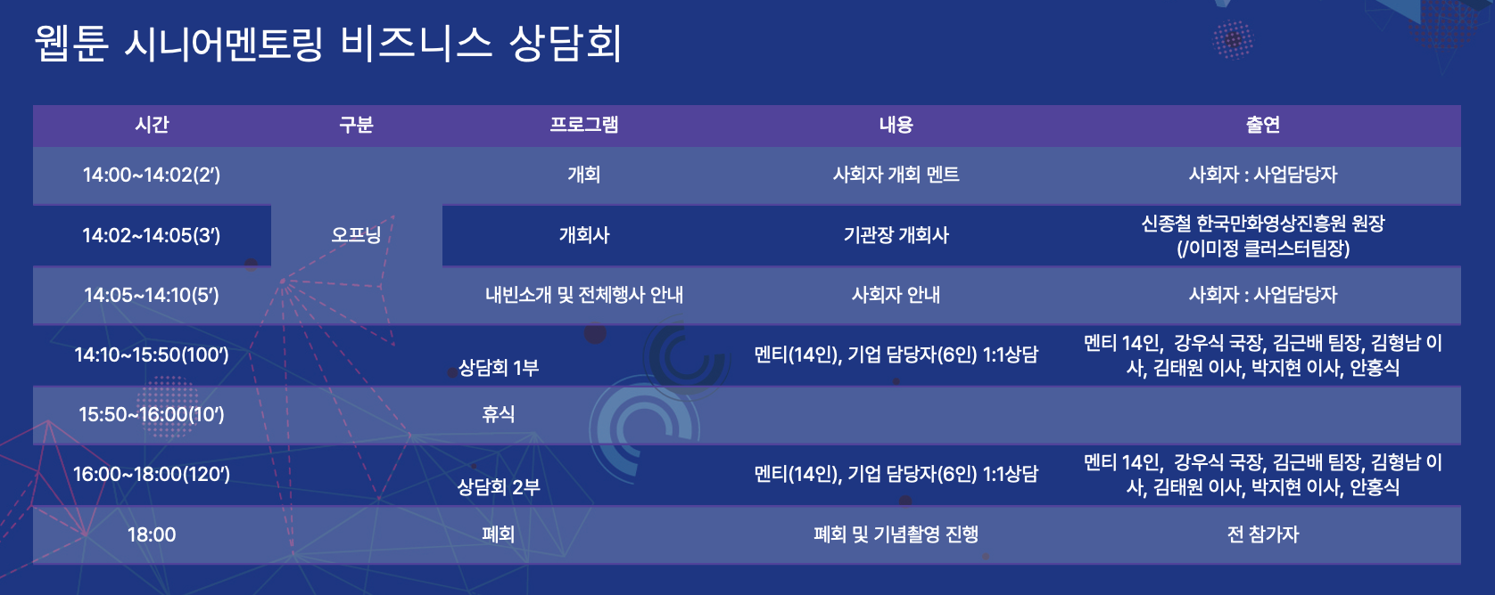 목적 | 2023 웹툰시니어 멘토링 지원사업 참여자(멘티 14명)의 작품의 연재 및 사업화 가능성 모색을 위한 비즈니스 상담회 개최